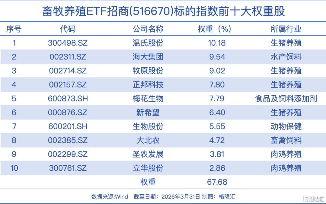 畜牧养殖ETF招商(516670)跟踪中证畜牧养殖指数,聚焦A股上市的头部养殖企业,“含猪率”超过六成,疫苗,饲料等养猪上下游 禽类、水产等养殖概念占比约40%,前十大成份股覆盖温氏股份、海大集团、牧原股份、正邦科技、梅花生物、新希望等养殖行业龙头。