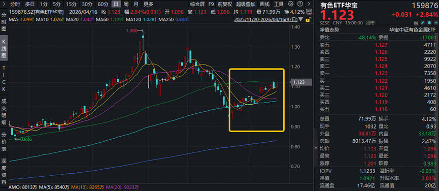有色ETF华宝(159876)及其联接基金(A类017140、C类017141)跟踪有色金属类指数,覆盖铜、铝、黄金、稀土、锂等细分行业,涵盖贵金属、战略金属、工业金属等不同类型标的。该ETF为融资融券标的。截至2026年3月底,基金规模18.91亿元,近1个月日均成交额超1亿元。投资者可参阅基金合同及招募说明书,结合自身风险承受能力自主判断。