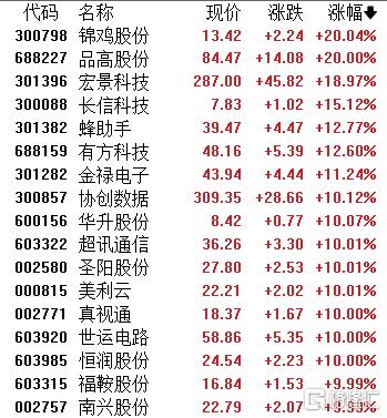 截至发稿,锦鸡股份、品高股份收获20CM涨停,华升股份、超讯通信、圣阳股份、美利云、真视通、世运电路、恒润股份等多股封板。