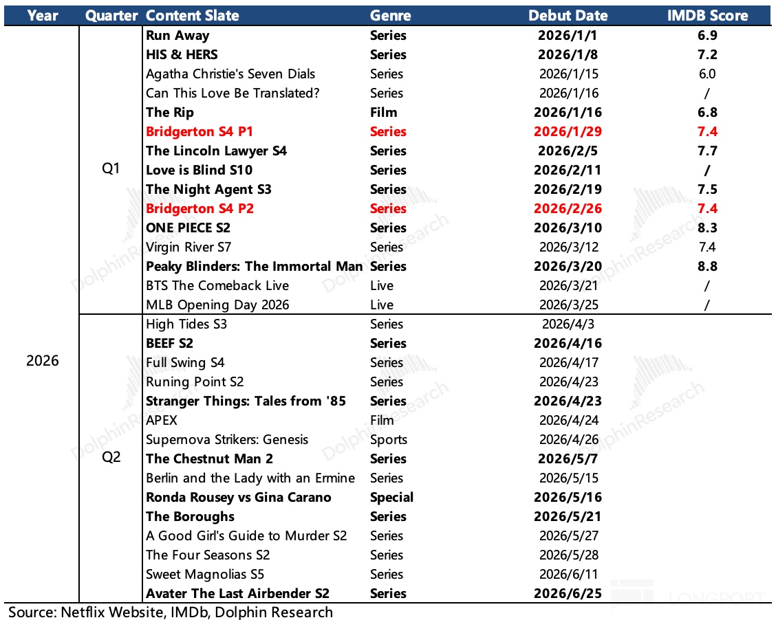 上季度海豚君就已经提及奈飞的最强内容周期已经进入尾声,Q1 还有《Bridgerton》第四季和去年末较晚上线的《Stranger Things》第五季撑着,但二季度的排片上就相对较弱了。