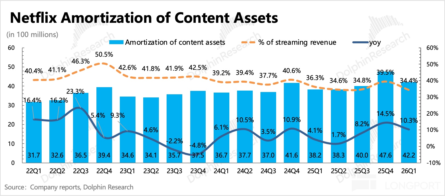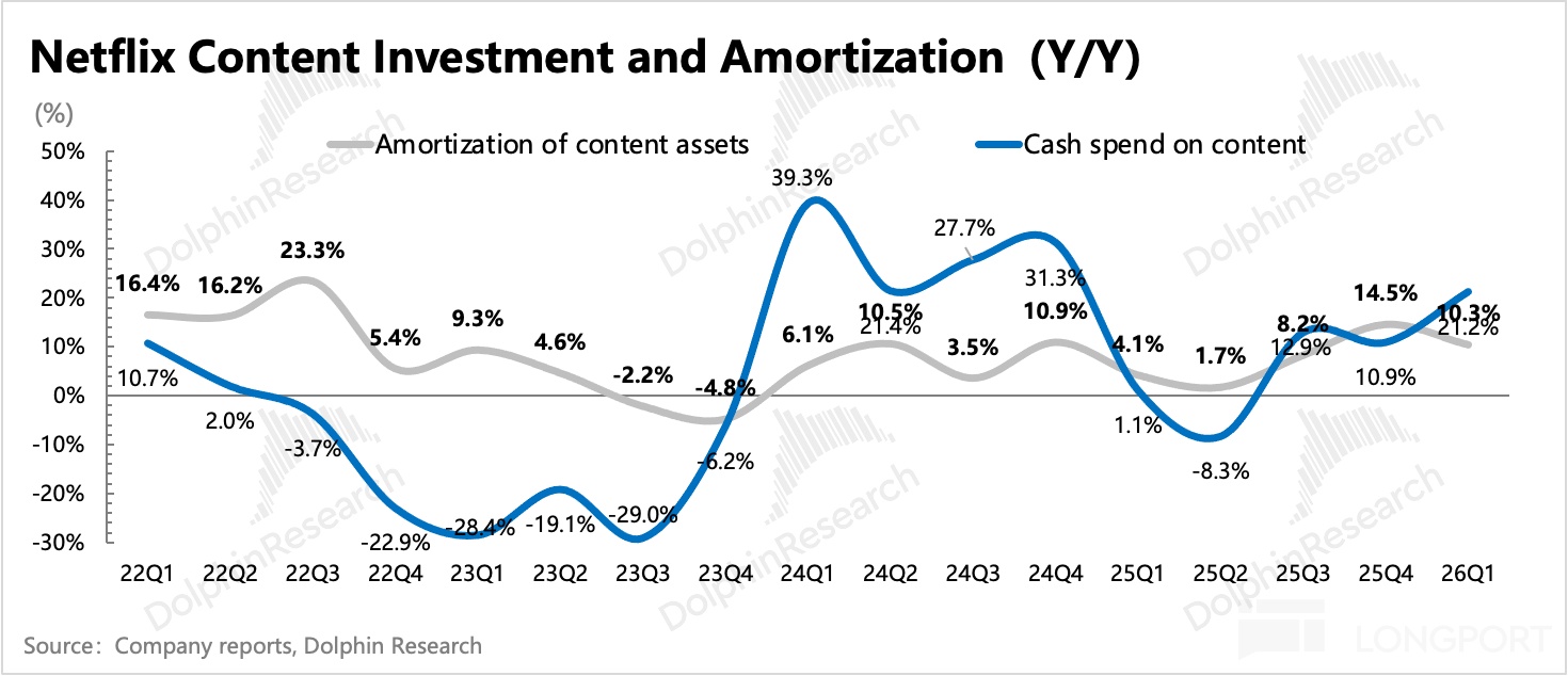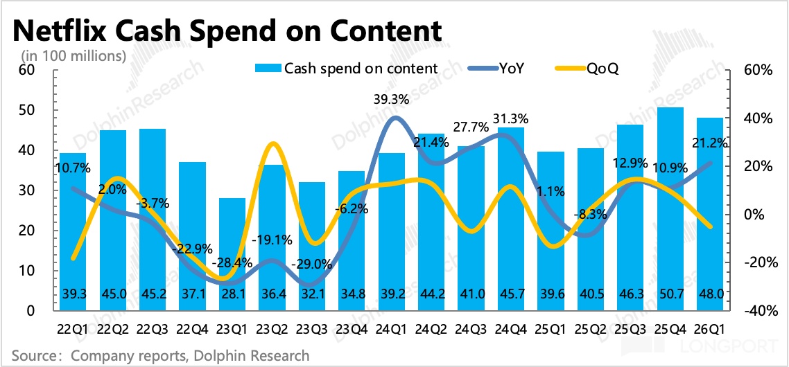 上季度电话会中,管理层透露了今年的内容投入预算:按照内容摊销成本增长 10%,内容现金投入/内容摊销成本=1.1x 的计划来算,预计全年内容投入规模接近 200 亿。原先海豚君认为,收购 WBD 带来的现金流压力,可能会促使奈飞实际做内容投入时会和去年一样有所控制。
