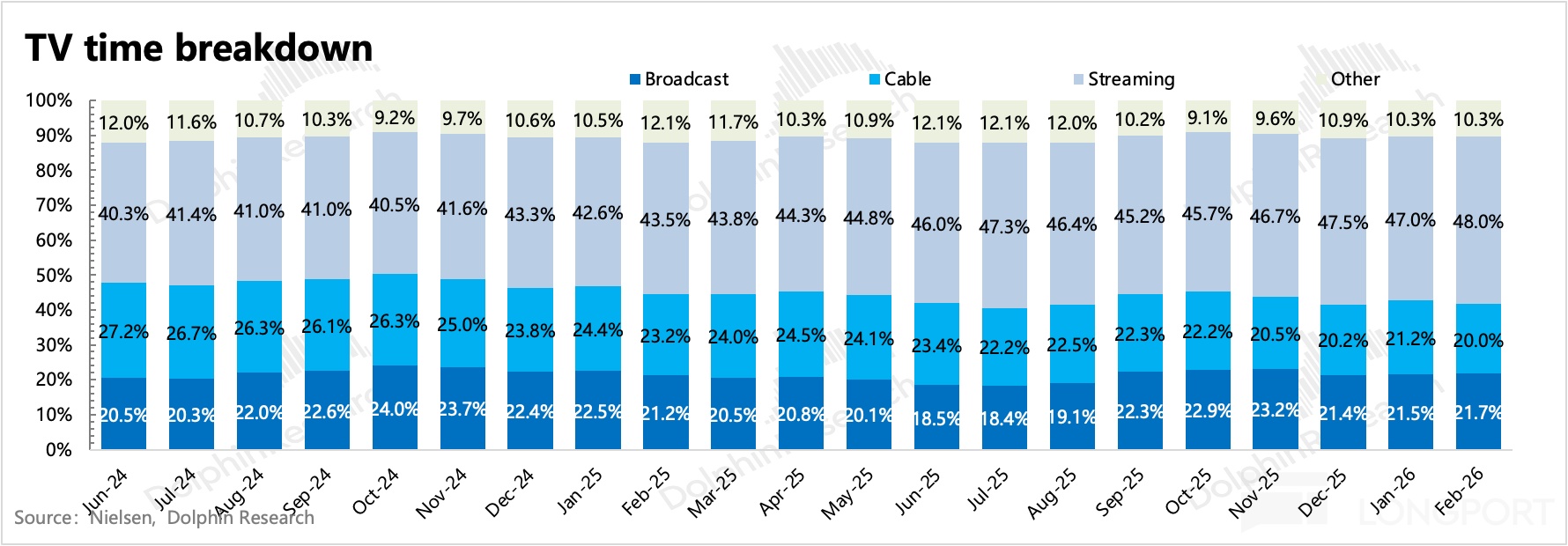 从北美 Nielsen 收视份额的数据来看,剪线趋势在走过 “后疫情线下经济回归” 导致的平台期后,近两年又有一些加速,截至 2 月流媒体收视份额提高到 48%。
