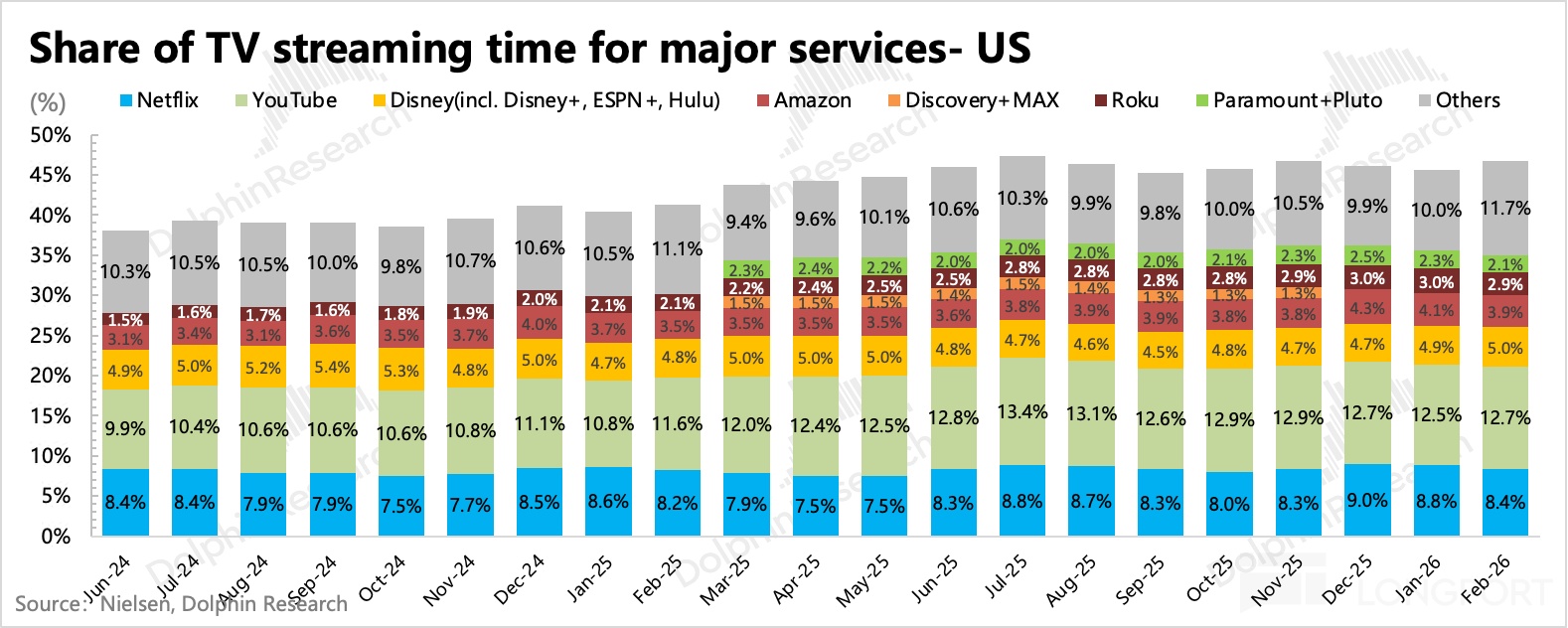 流媒体中,奈飞的份额相对稳定,12 月因为《Stranger Things》第五季,收视率明显有反弹。同期 YouTube 保持平稳,Disney 则有一些反弹,头部之外的其他平台继续上升,说明一些中小平台也有自己的垂类优势。