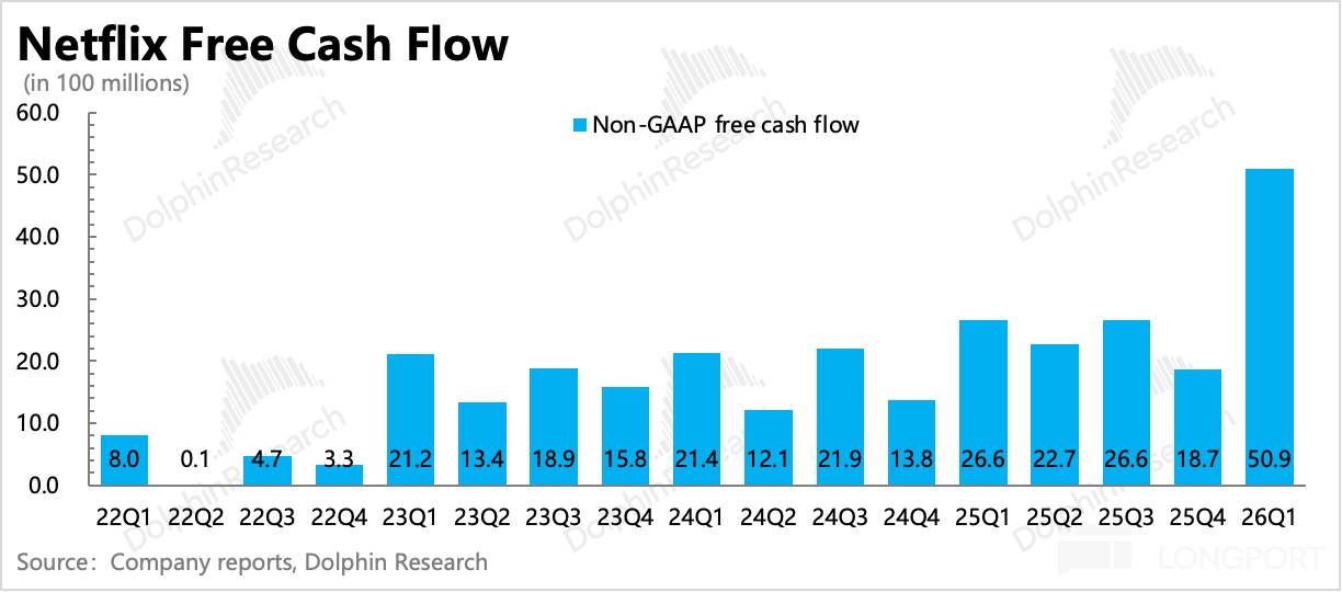 虽说海豚君对原先的 WBD 收购案更偏向积极看待(我们对 Netflix 在内容周期过后的内生增长惯性能否保持有一些担忧,因此会更期望),但也还是得承认,这笔收购案如若成交,对 Netflix 的现金流和负债压力是肉眼可见的大。这对于近几年的 Netflix 多头资金而言,并不乐见其成。