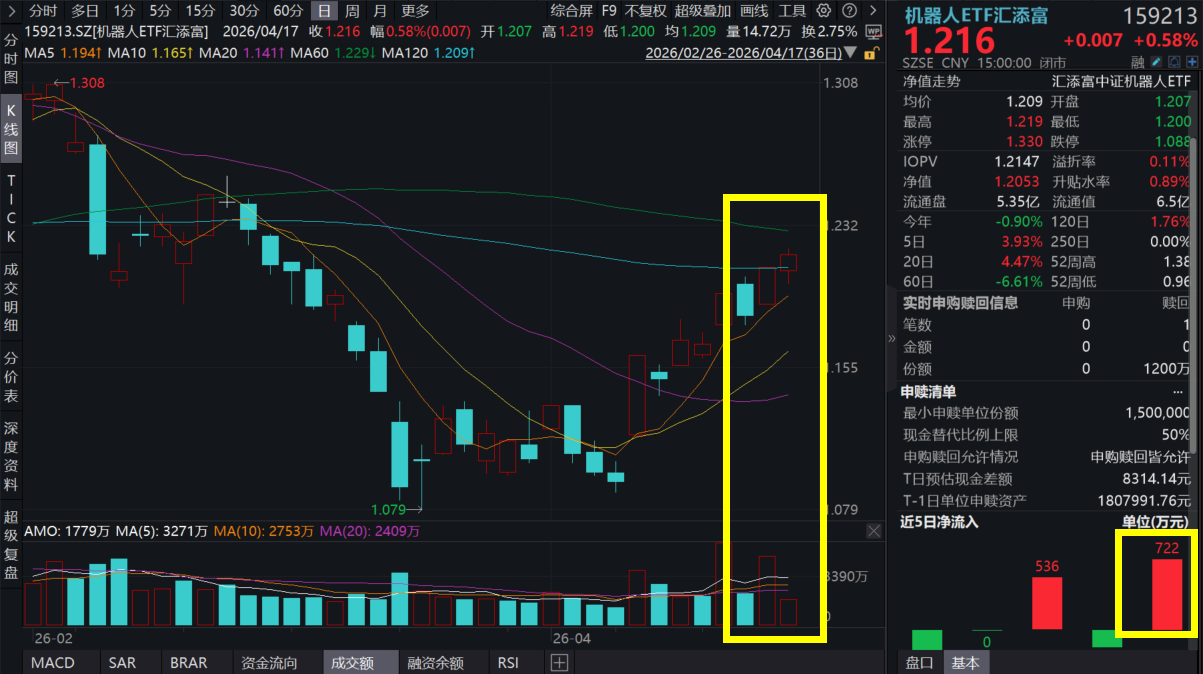 4月17日,A股市场震荡回调,上证指数微跌0.1%,机器人板块逆势冲高!截至收盘,机器人ETF汇添富(159213)涨0.58%,喜提两连阳,创反弹以来新高!