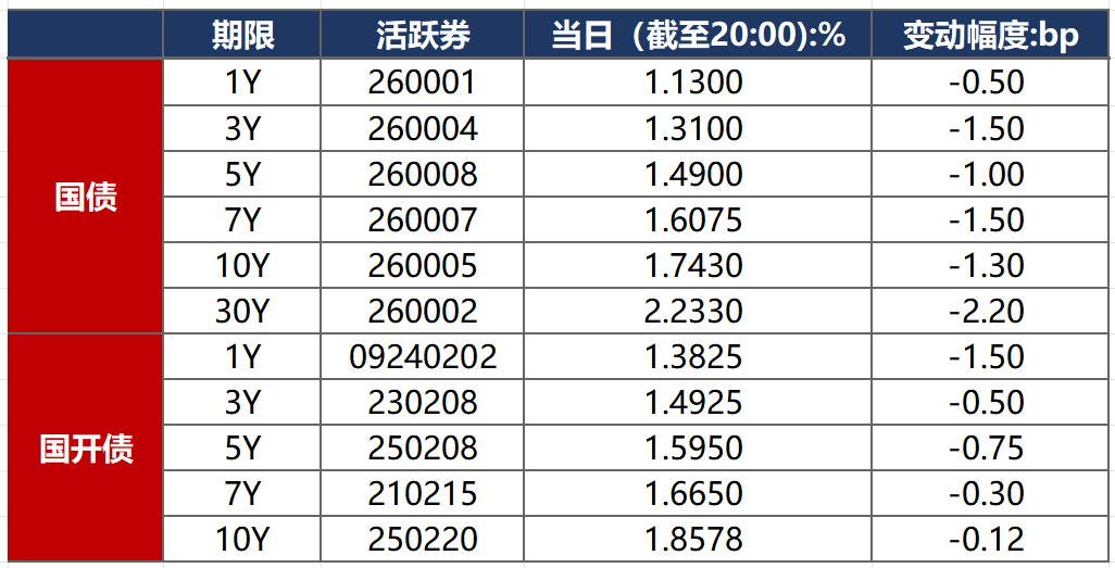 4月21日,流动性利好下,多头情绪延续,债市持续走强。截至北京时间20:00,10年期国债活跃券260005收益率下行1.30bp至1.7430%,10年期国开债活跃券250220收益率下行0.12bp至1.8578%。