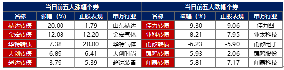 【转债市场主要指数集体收跌】 4月21日,转债市场有所调整,中证转债、上证转债、深证转债分别收跌0.36%、0.35%、0.37%。转债市场成交额750.49亿元,较前一交易日缩量23.64亿元。转债市场个券多数下跌,341只转债中,111只收涨,220只下跌,10只持平。当日上涨个券中,赫达转债涨停20%,金宏转债涨超12%;下跌个券中,佳力转债跌逾9%,亚科转债跌逾8%。