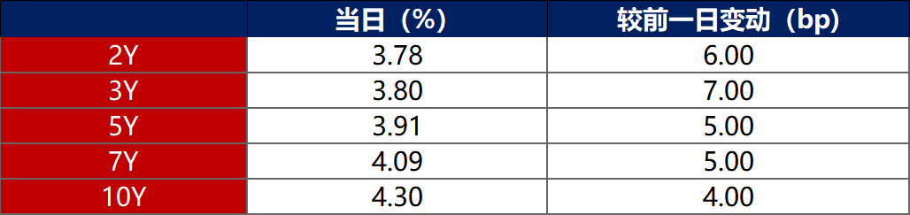 4月21日,各期限美债收益率普遍上行。其中,2年期美债收益率上行6bp至3.78%,10年期美债收益率上行4bp至4.30%。