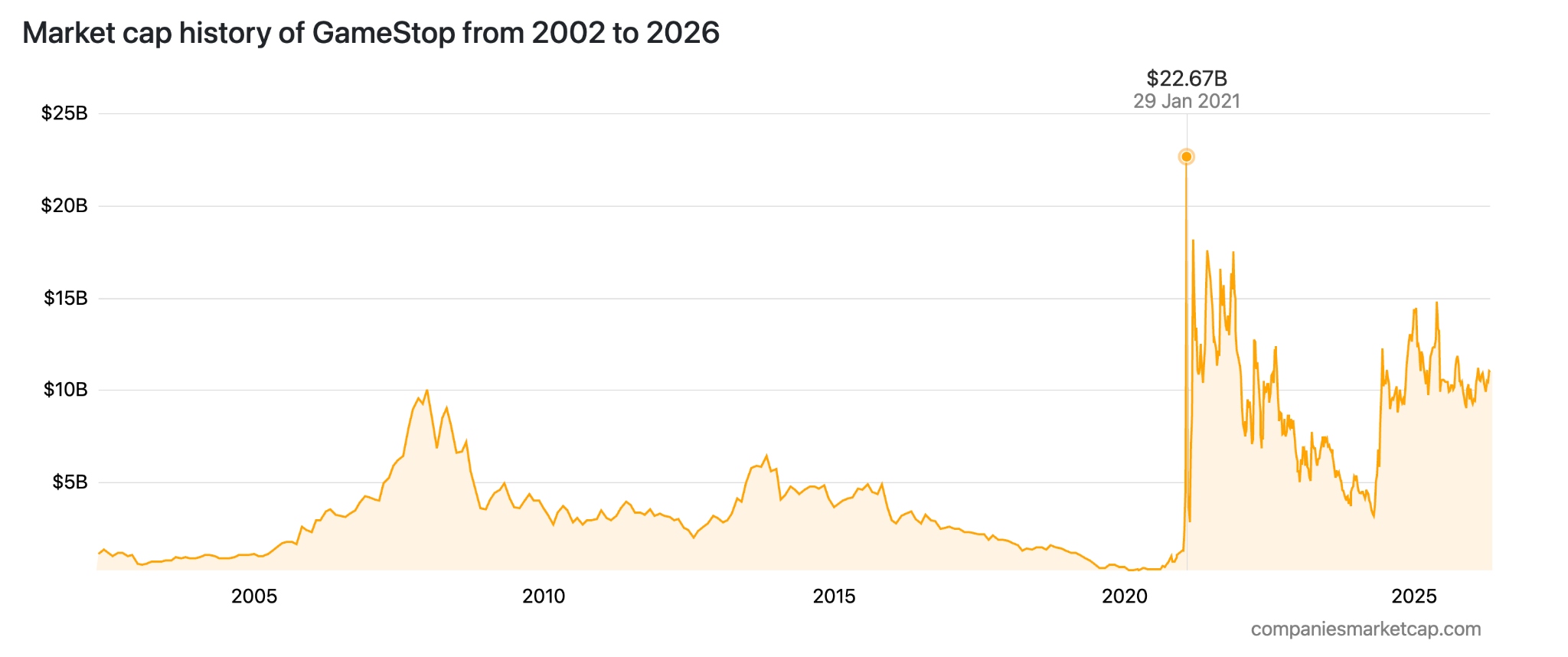 【游戏驿站轧空泡沫破裂后暴跌,来源:Companiesmarketcap】