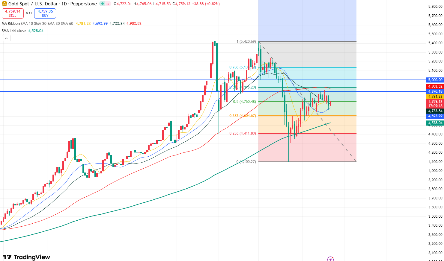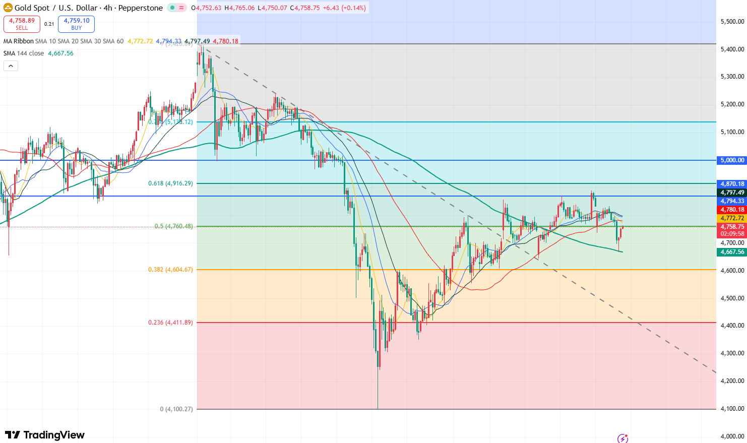 上行方面,首先需要注意斐波那契0.5回撤位4760美元,若黄金能强势突破并站稳此位置上方,将再度打开通往4870美元压力位的上行空间,在网上则是5000美元整数关口。
