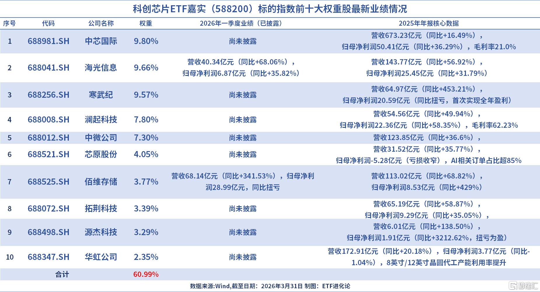 国内层面,科创板芯片个股业绩表现同样亮眼。科创芯片ETF嘉实(588200)持仓的核心标的中,海光信息2026年一季度营收40.34亿元,同比增长68.06%,归母净利润6.87亿元,同比增长35.82%,AI算力芯片需求的持续爆发推动其业绩稳步高增;佰维存储2026年一季度营收68.14亿元,同比激增341.53%,归母净利润28.99亿元,实现扭亏为盈,单季净利润超过2025年全年,直接受益于存储芯片涨价周期;寒武纪2025年实现归母净利润20.59亿元,首次实现全年盈利。