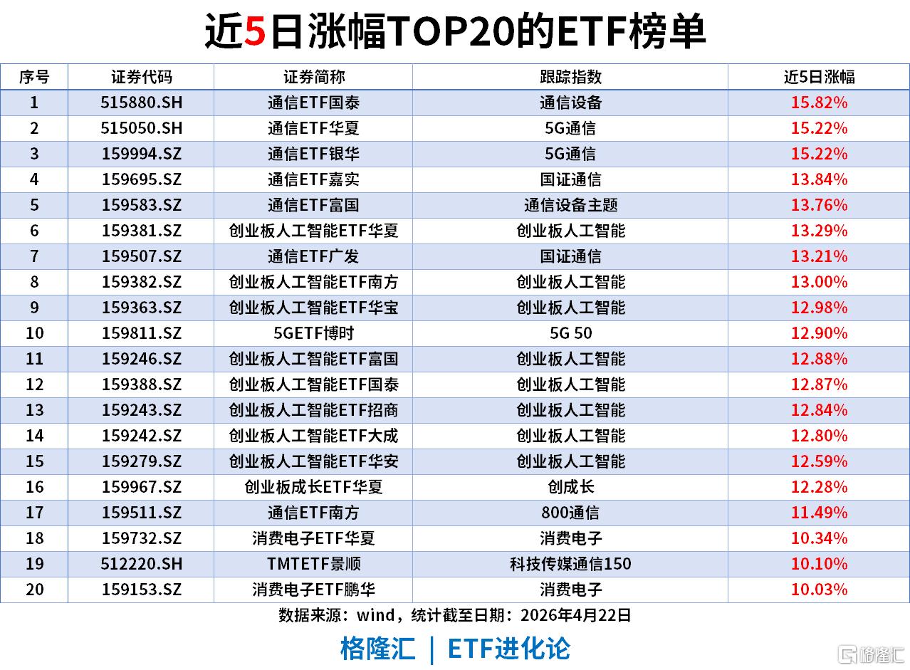 通信板块强势领跑,创业板人工智能与消费电子赛道同步发力,科技成长主线清晰。通信行业主题ETF包揽榜单前7席,通信ETF国泰以15.82%领跑,创业板人工智能ETF涨幅均超12%;消费电子ETF华夏、消费电子ETF鹏华同步录得10%的涨幅。