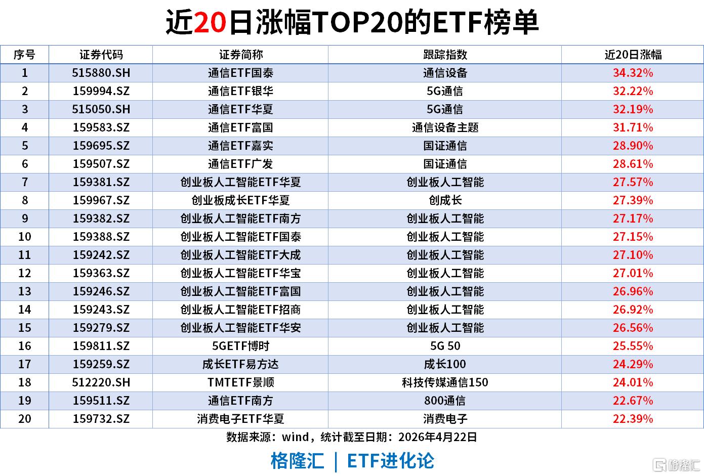 近20日涨幅(截至2026年4月22日)