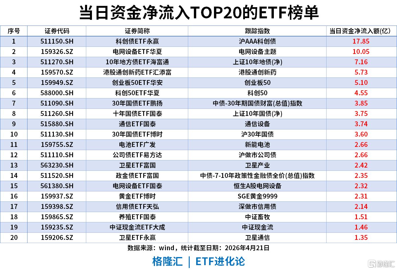 当日资金呈现固收与成长双主线并行的格局,科创债ETF永赢以17.85亿净流入领跑,电网设备ETF华夏以10.05亿净流入位列第二,港股通创新药ETF汇添富净流入5.73亿元。