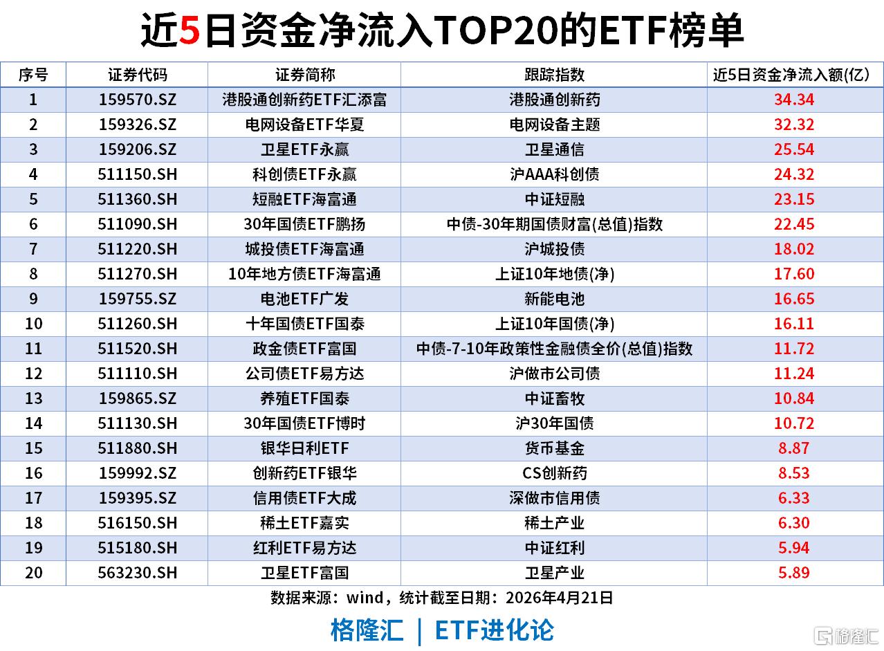 中期资金医药与科技成长双主线驱动,港股通创新药ETF汇添富以34.34亿净流入大幅领跑,30年国债ETF鹏扬、城投债ETF海富通、地方债ETF海富通等债类品种合计流入超90亿。