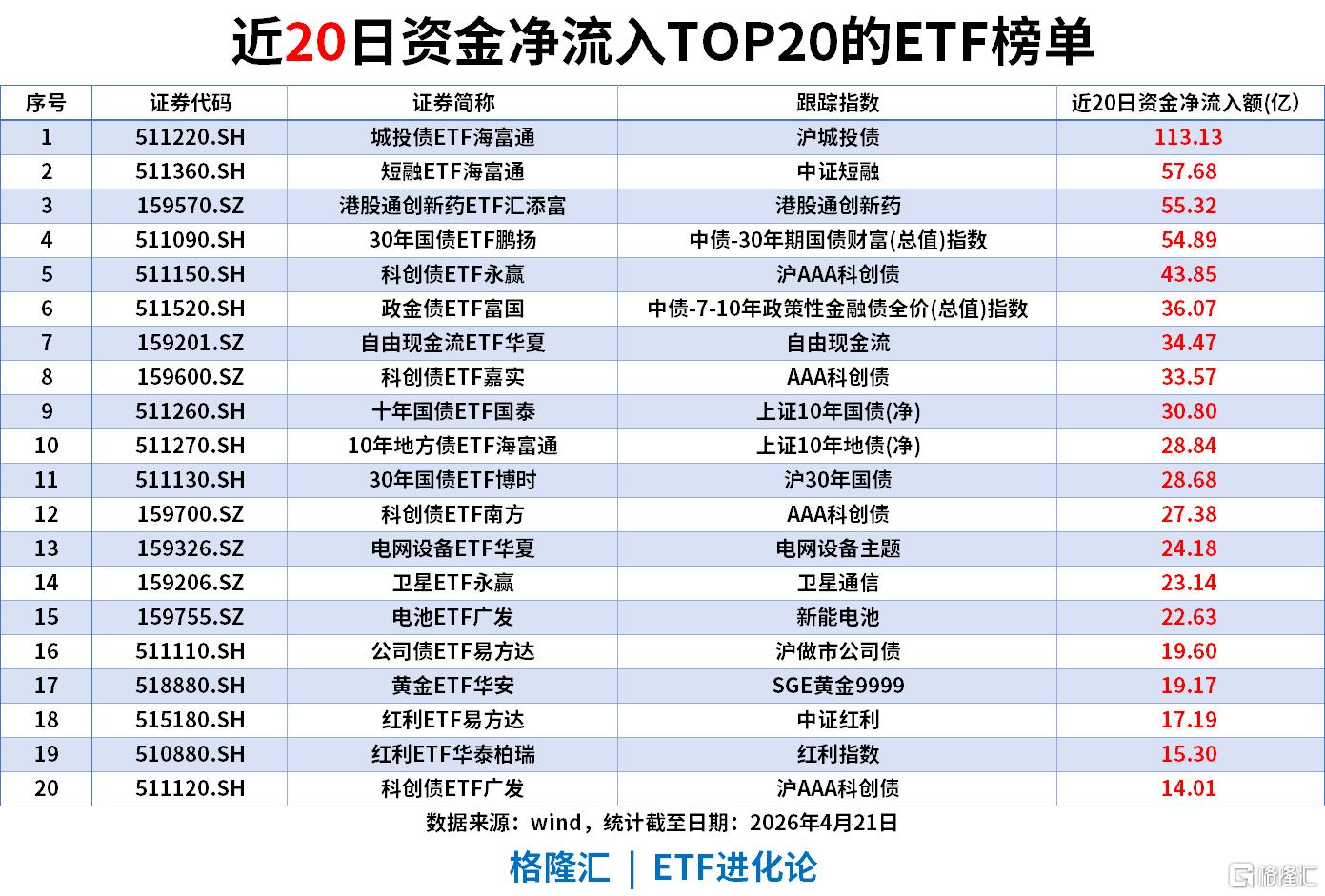 近20日资金净流入(截至2026年4月21日)