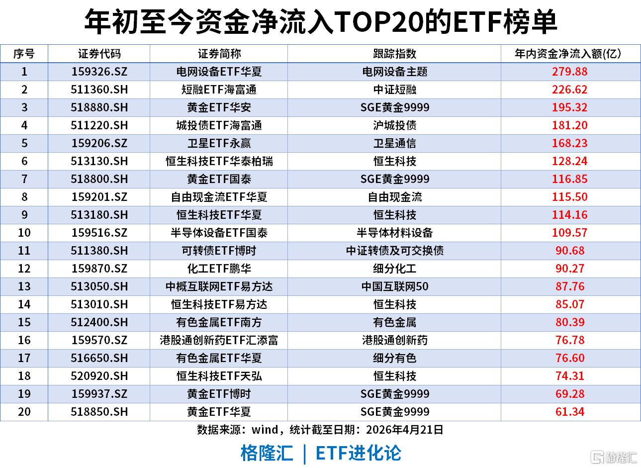 年初至今资金净流入(截至2026年4月21日)