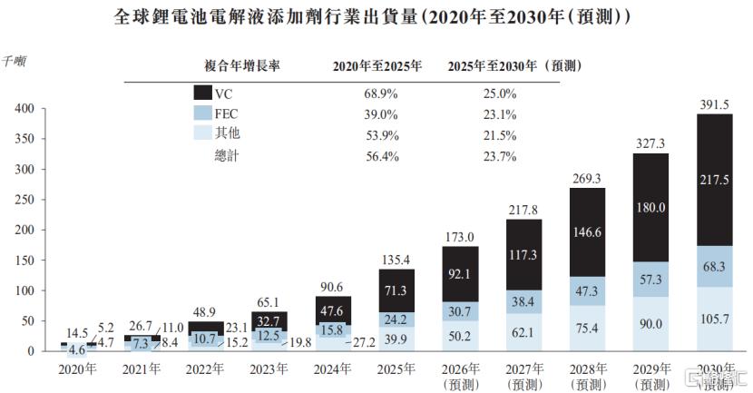 根据灼识咨询,全球锂电池电解液添加剂市场规模从2020年的1.45万吨增至2025年的13.54万吨,复合年增长率为56.4%。