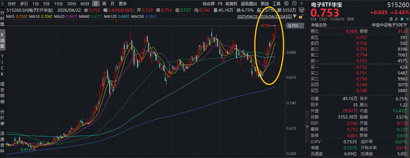接着奏乐接着舞!PCB龙头东山精密、鹏鼎控股涨停,同创历史新高,荟聚电子板块核心龙头的电子ETF华宝(515260)场内价格猛拉3.43%,12天11阳强势突破,于今日(4月22日)刷新上市以来的高点!