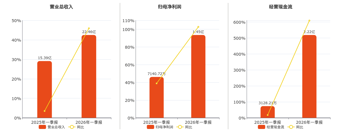 公司营业总收入为22.46亿元,较去年同报告期营业总收入增加7.07亿元,实现2年连续上涨,同比较去年同期上涨45.93%。归母净利润为1.45亿元,较去年同报告期归母净利润增加7331.39万元,实现2年连续上涨,同比较去年同期上涨102.67%。经营活动现金净流入为2.22亿元,较去年同报告期经营活动现金净流入增加1.90亿元,实现2年连续上涨,同比较去年同期上涨608.82%。
