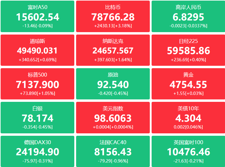 外盘:中东紧张局势有望缓解为市场注入了乐观情绪,美股集体收涨,其中道指涨340.65点,涨幅0.69%报49490.03点;标普500涨73.89点,涨幅1.05%报7137.90点,纳指涨397.60点,涨幅1.64%报24657.57点再创新高;热门科技股普涨,博通涨超5%,亚马逊、微软、苹果、谷歌涨超2%,英伟达涨超1%。半导体、加密储备概念、存储概念股涨幅居前,纳微半导体涨超20%,Arm涨超12%,美光科技、闪迪、Circle涨超8%,AMD涨超6%,Coinbase涨超5%。联合大陆航空跌超5%,达美航空跌超2%,凯悦酒店跌超3%;热门中概股多数上涨,霸王茶姬涨超4%,拼多多涨超1%,小鹏汽车跌超1%,哔哩哔哩跌超2%,爱奇艺跌超5%。