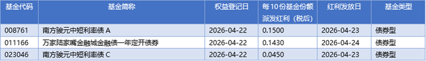 (1)04月22日新发基金共有13只,主要为债券型基金和混合型基金,其中华夏港股通消费精选混合A募集目标金额达80.00亿元;基金分红3只,多为债券型,派发红利最多的基金是南方骏元中短期利率债债券型证券投资基金,每10份基金份额派发红利0.1500元。