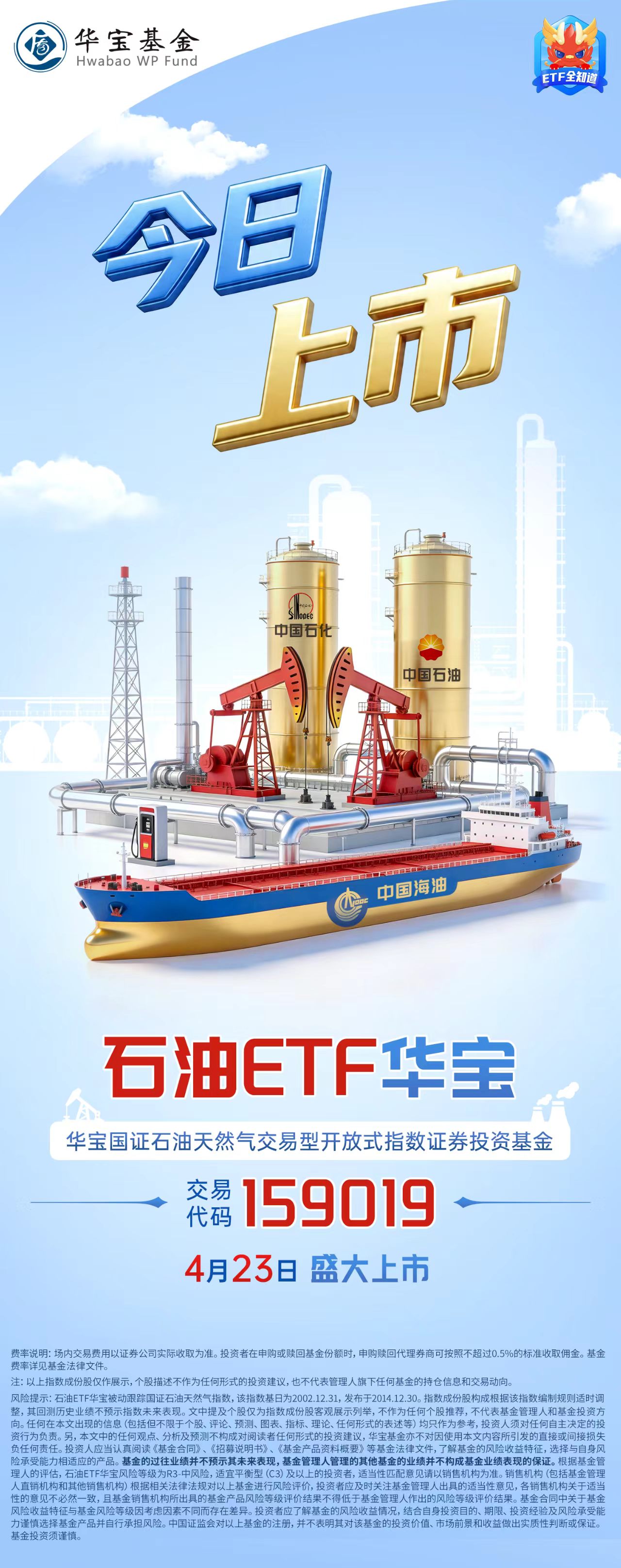 在指数投资领域,华宝基金秉持金融服务实体经济的初心,致力于在专业投资、价值投资、长期投资理念指引下为市场持续推出具备中长期生命力的ETF产品,以高效能科技金融服务产业迭代升级和新质生产力发展。目前,华宝基金已成功建成 “AI产业链”、“周期”、“消费”、“医药”、“高股息”、“主流宽基”等多元ETF矩阵。据沪深证券交易所数据统计,截至2026年4月21日,华宝基金旗下权益类ETF资产管理规模已达1306.12亿元,稳居行业排名前十。由化工ETF华宝(516020)及联接基金(A 012537、C 012538)、有色ETF华宝(159876)及联接基金(A 017140、C 017141)、农牧渔ETF华宝(159275)及联接基金(A 013471、C 013472)、华宝油气LOF(A 162411、C 007844)组成的华宝基金周期性指数产品矩阵亦颇具特色。截至今年3月31日,化工ETF华宝(516020)规模超60亿元;有色ETF华宝(159876)规模达18.91亿元,近一月日均成交额超1亿元,在全市场跟踪同标的指数的三只ETF产品中,规模、流动性均居首位。华宝油气LOF则为目前全市场规模最大的油气LOF基金。此次石油ETF华宝(159019)的上市,将为华宝基金周期性ETF矩阵进一步多元化发展增加关键一环。