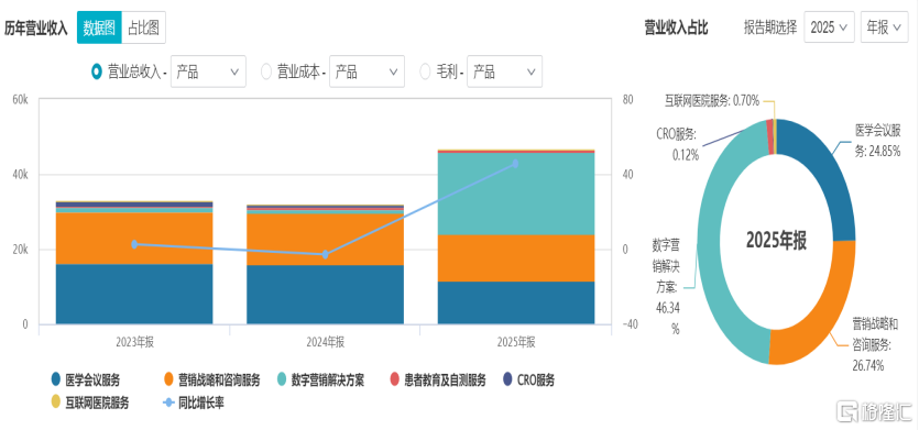拆解收入构成可以发现,公司数字营销解决方案服务收入从2024年的仅1010万元飙升至2.17亿元,占比从3.1%跃升至46.4%,取代传统医学会议服务成为第一大收入来源。这意味着,麦迪卫康已不再是一家单纯靠“办会”赚钱的传统服务商:AI驱动的数字化业务正在成为新的增长引擎,公司向“医疗专业服务 前沿AI数字科技”双轮驱动的战略转型。