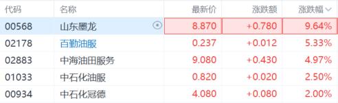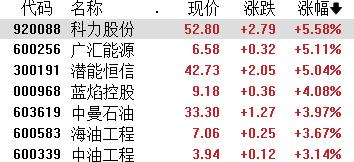 港、A市场油气股全线走高。A股中,科力股份、广汇能源、潜能恒信涨超5%,蓝焰控股涨超4%;港股中,山东墨龙涨超9%,百勤油服涨超5%,中海油田服务、中石化油服跟涨。