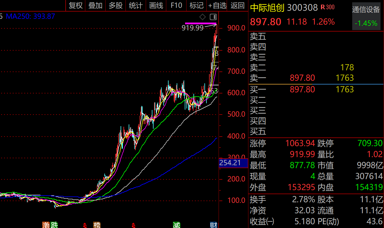 4月23日,A股又一万亿巨头诞生,光模块龙头中际旭创继续新高之旅,盘中最高涨至919.99元,市值约1.02万亿,成为A股第8位“万亿俱乐部”成员。