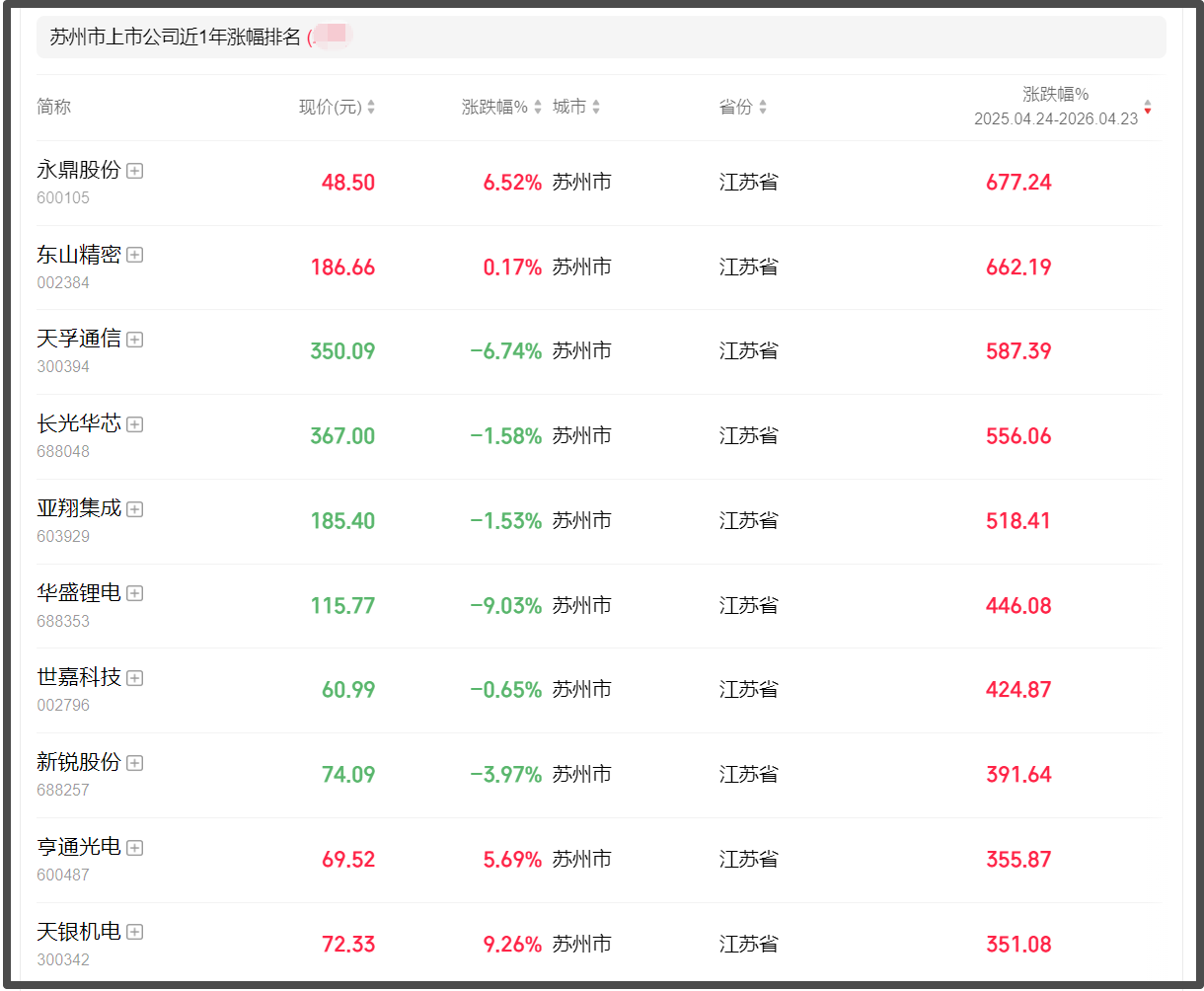 除了中际旭创,苏州还涌现了一批超级牛股,堪称“赢麻了”。永鼎股份(680%)、东山精密(675%)、天孚通信(590%)、长光华芯(565%)、亚翔集成(525%)、华盛锂电(458%)、世嘉科技(430%)、新锐股份(395%)、亨通光电(360%)、天银机电(343%)等涨幅均超过3倍。