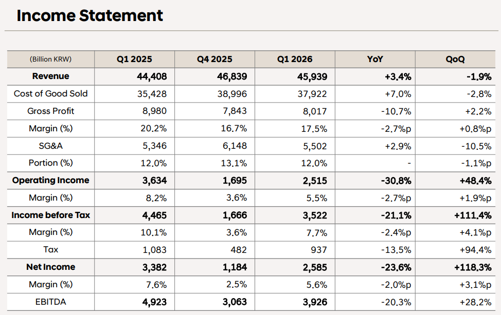 TradingKey - 现代汽车公布2026年第一季度财报。期内,净利润为2.59万亿元(韩元,下同),同比下滑23.6%,环比增长118.3%;营业利润为2.51万亿元,同比下滑30.8%,逊于市场预期的2.81万亿元。