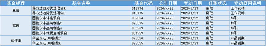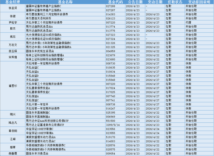 基金经理是一只基金产品最核心的成员,能决定一只基金的投资方向、投资策略以及投资风格,基金经理出色的择时选股能力和调研预测能力是基金业绩的有力保证,所以基金经理是投资者在选择基金产品时的重要依据。基金经理的变动很大程度上会影响到基金产品未来的表现,是一个需要特别关注的信息。4.23日共有20位基金经理发生任职变动。