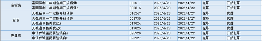 新基金经理上任方面,其中4.23日有45只基金产品发布基金经理任职公告,涉及6名基金经理。富国基金张圣贤现任基金资产总规模为196.86亿元,管理过的基金都为指数型基金,任职期间回报最高的产品是富国中证煤炭指数(LOF)A(161032),为指数型基金,在任职的8年又149天时间内获得107.35%的回报,至今仍在管理该基金。张圣贤新任富国中证畜牧养殖产业指数A、富国中证畜牧养殖产业指数C这两只基金产品的基金经理。