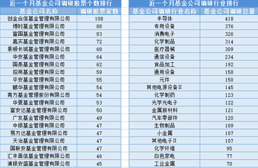 近一个月(3月24日-4月23日),创金合信基金参与公司调研的数量最多,共调研108家上市公司,此外调研较为活跃的还有博时基金、富国基金和嘉实基金,分别调研88家、83家、72家上市公司;从调研行业上来看,基金公司对半导体行业的上市公司调研次数最多,共有418次,其次是专用设备行业,基金公司调研了376次。