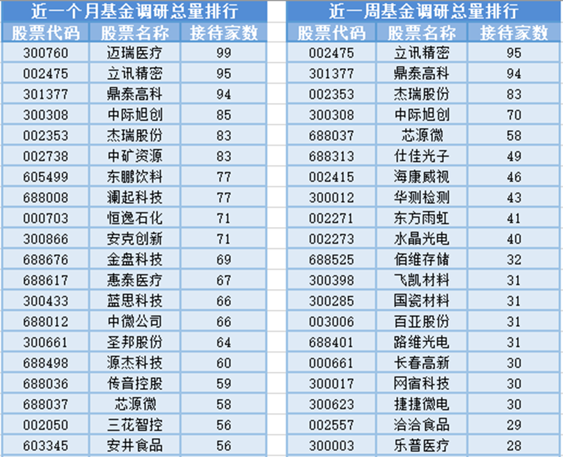 从个股调研情况上来看,最近1个月(3月24日-4月23日)最受公募基金关注的是迈瑞医疗,迈瑞医疗属于医疗设备行业,主营业务为医疗器械的研发、制造、营销及服务。共有99家基金管理公司参与调研,其次是立讯精密和鼎泰高科,分别接受95家、94家基金管理公司的调研。