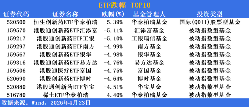 跌幅方面,港股创新药板块大幅调整,创新药主题ETF集体下挫
