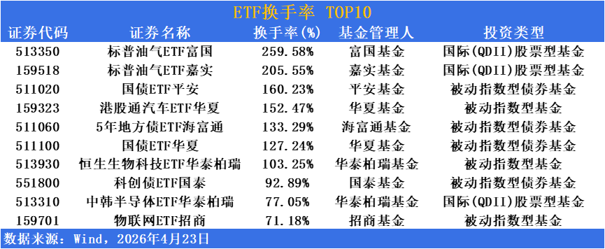 国债ETF平安(511020)换手率超160%,港股通汽车ETF华夏(159323)换手率超152%,5年地方债ETF海富通(511060)换手率超133%,国债ETF华夏(511100)换手率超127%,恒生生物科技ETF华泰柏瑞(513930)换手率超103%,科创债ETF国泰(551800)换手率超92%,中韩半导体ETF华泰柏瑞(513310)换手率超77%,物联网ETF招商(159701)换手率超71%,债券型与跨境权益产品同样热度高企,进一步印证股债两市资金对高流动性工具的追逐,以及地缘冲突反复与债牛行情下交易型资金的积极参与。