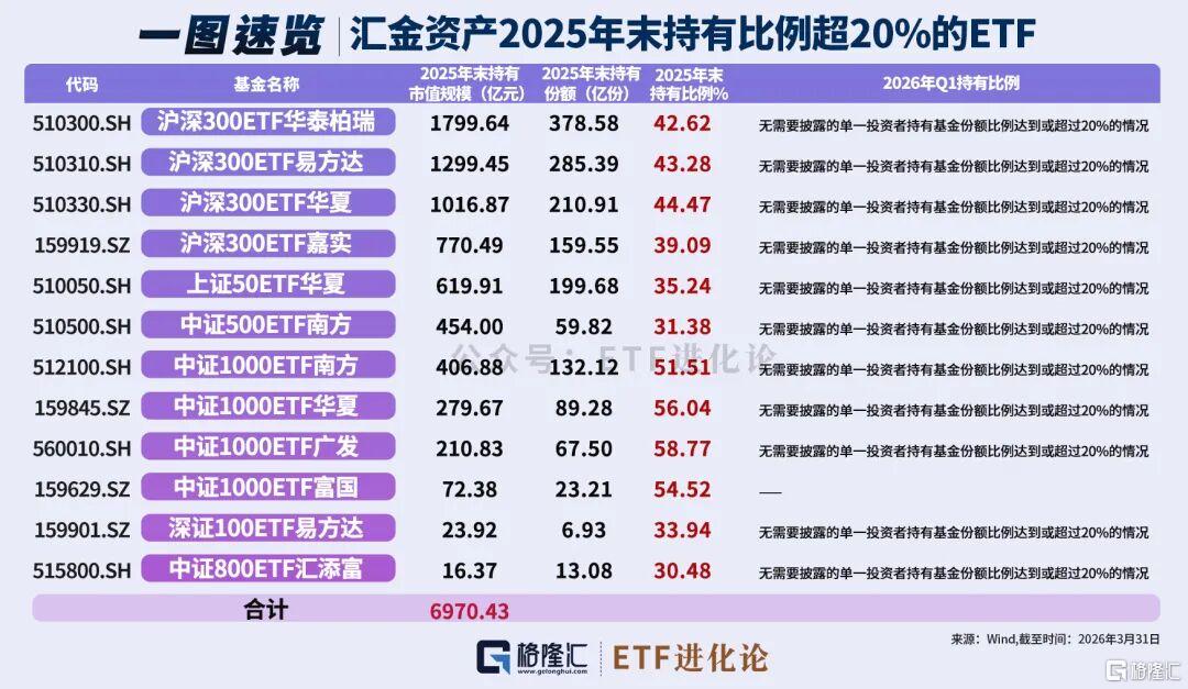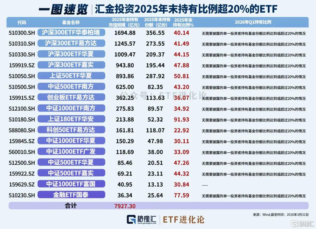 也就是说,今年一季度,汇金投资在这15只ETF的份额占比都降低到20%以下。