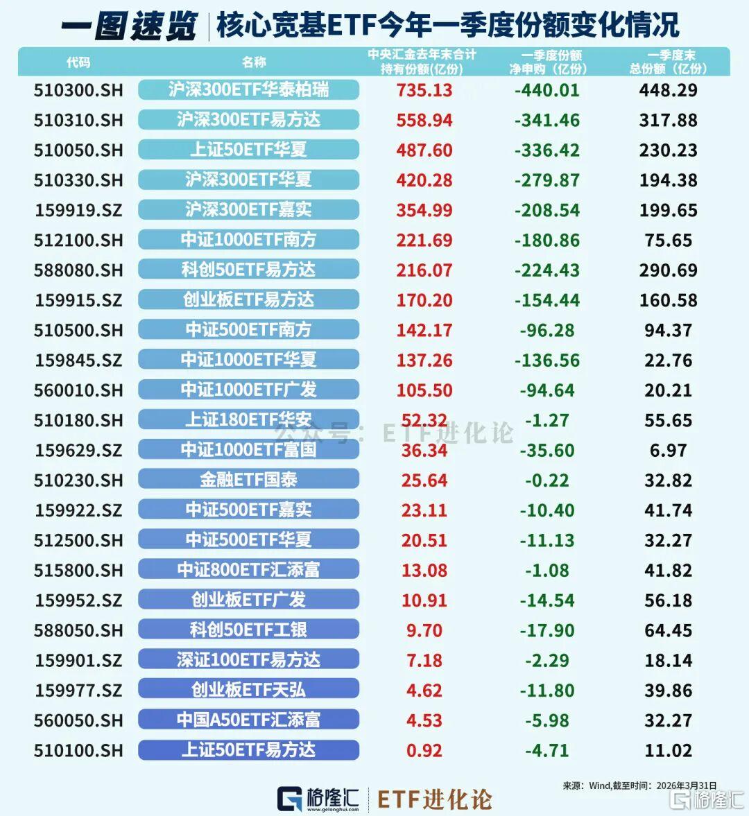 股市热度重回之际,最新披露的核心宽基ETF一季报,“国家队”的动态随着浮出水面,为1月精准踩刹车的过程提供更多细节。