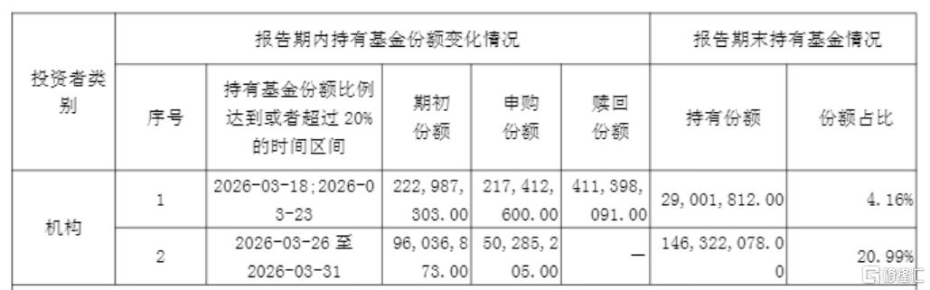 其中“机构1”在3月18日、3月23日申购2.17亿份、赎回4.11亿份,最终持有0.29亿份。