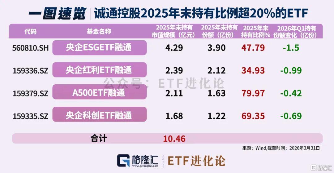 此外,诚通控股去年年末持有比例超20%的ETF有4只,这四只ETF——央企ESGETF融通、央企红利ETF融通、A500ETF融通和央企科创ETF融通在一季度均被赎回。