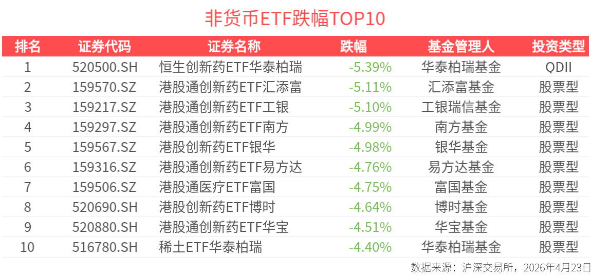 截至今日收盘,全市场共计1150只非货ETF下跌,下跌比例达79%。行业主题指数方面,恒生创新药指数、国证港股通创新药指数跌幅居前,分别下跌5.47%、4.93%。