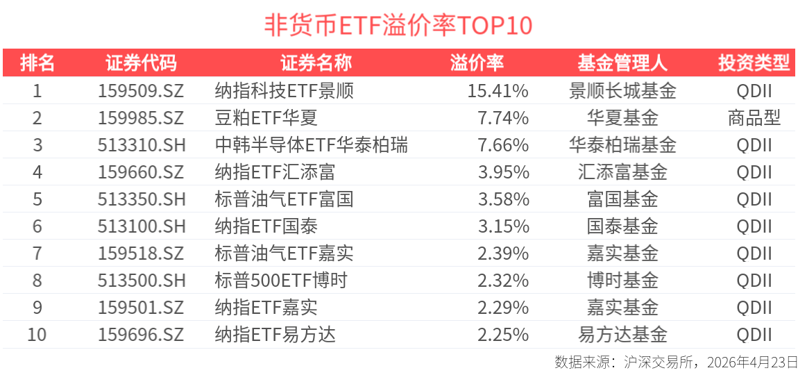 截至今日收盘,纳斯达克科技市值加权指数溢价居前,纳指科技ETF景顺收盘溢价15.41%;大商所豆粕期货价格指数情绪高涨,豆粕ETF华夏收盘溢价7.74%。