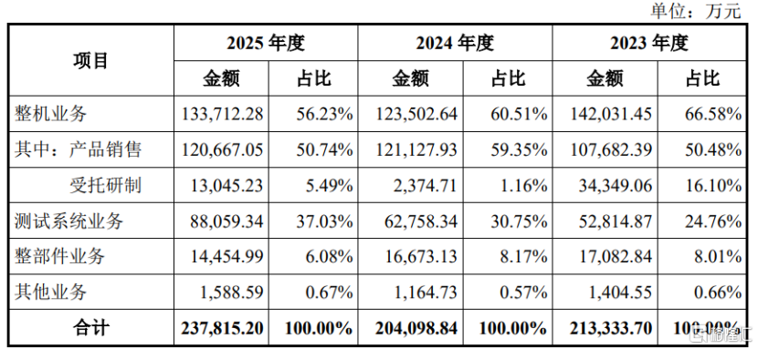从营收构成来看,2023年、2024年、2025年(简称“报告期”),公司超过56%的营收来自整机业务,测试系统业务的营收占比从24.76%提升至37.03%,整部件及其他业务的营收占比较低。