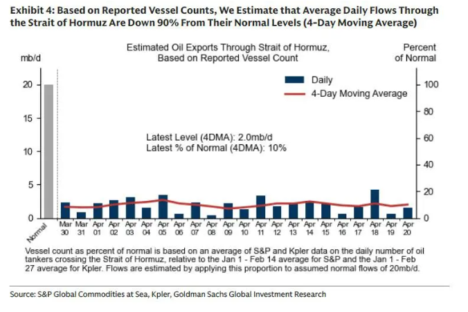 霍尔木兹海峡石油日均通行量仅为正常水平10%,约200万桶(4日移动均值)。即便海峡完全解封,受复产关停逆转、油轮航行周期、管道运输限速等物流限制,航运恢复也将循序渐进,全球库存下滑趋势至少延续至5月及以后。