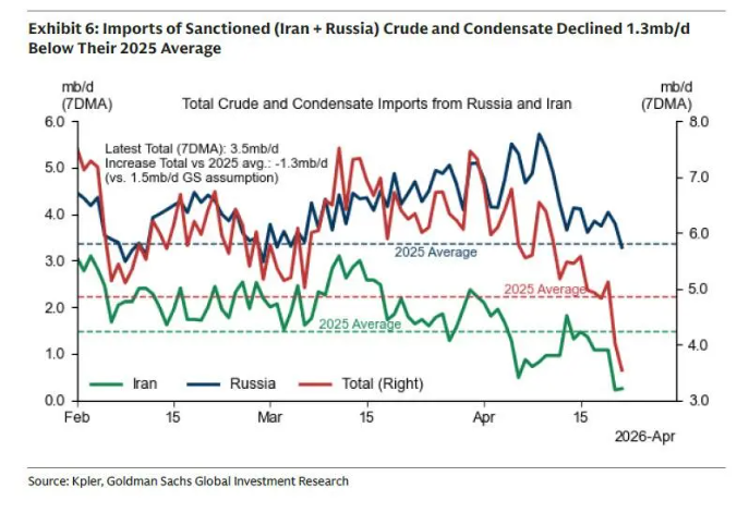 而核心危机就在于:全球海上石油缓冲库存即将耗尽。不受制裁的海上石油逼近历史低位、对俄罗斯石油的进口已低于2025年均值、而美国对伊朗的海运石油进口豁免到期未续期。