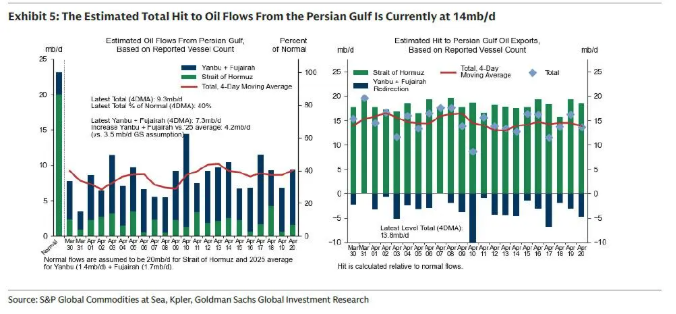 综合所有因素,高盛警示:虽然该行基准油价预测与当前市场价接近,双向风险并存,但霍尔木兹航运长期中断、中东石油供应持续收缩,将带来巨大净上行风险。