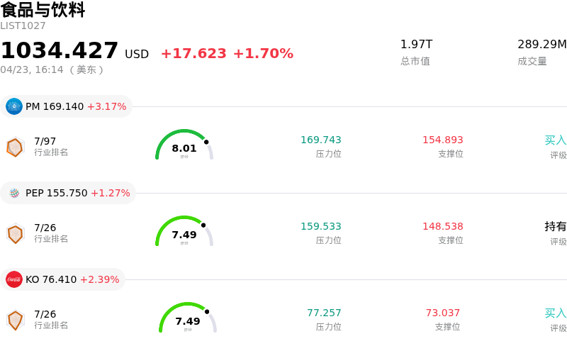 奥驰亚集团 (MO) 收盘上涨3.04%, 所属行业食品与饮料上涨1.70% ,公司涨幅跑赢行业涨幅,行业成交额前三股票 菲利浦莫里斯国际公司 (PM) 上涨 3.17%;百事 (PEP) 上涨 1.27%;可口可乐 (KO) 上涨 2.39%。