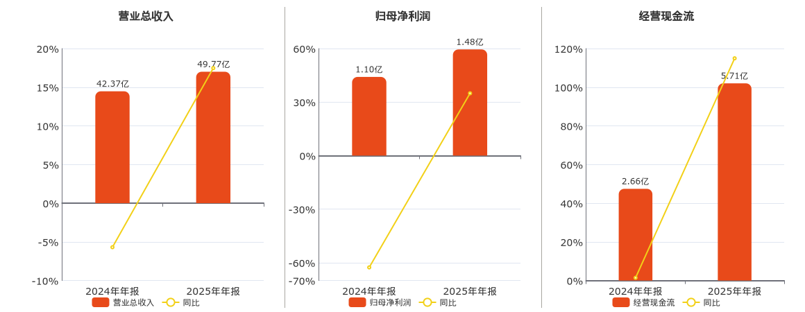 公司营业总收入为49.77亿元。归母净利润为1.48亿元,在已披露的同业公司中排名第6。经营活动现金净流入为5.71亿元。
